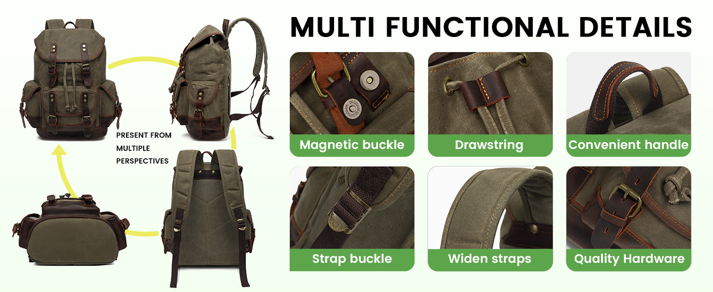 HuaChen Canvas Backpack: Adventure in Style At HuaChen, we believe in crafting backpacks that are not only durable and reliable but also stylish and versatile. Whether you’re commuting to work or exploring new cities, our canvas backpacks are the perfect companion for all your adventures. Crafted from premium quality waxed canvas, our backpacks are water-resistant, ensuring your belongings stay dry and protected in any weather. The genuine leather accents lend a timeless appeal and make our backpacks even more sturdy and long-lasting. The backpack features adjustable shoulder straps with padded panels for comfortable carrying and an ergonomic design that distributes the weight evenly across your back. Our collection of backpacks includes a range of designs that cater to different needs. From casual daypacks to traditional bags, we have a variety of styles to choose from. For those who commute with laptops, we have a selection of laptop backpacks that feature padded sleeves to keep your device safe and secure. Our rolling backpacks are perfect for travel and come with rigid backs that fit the size requirements for carry-on baggage.