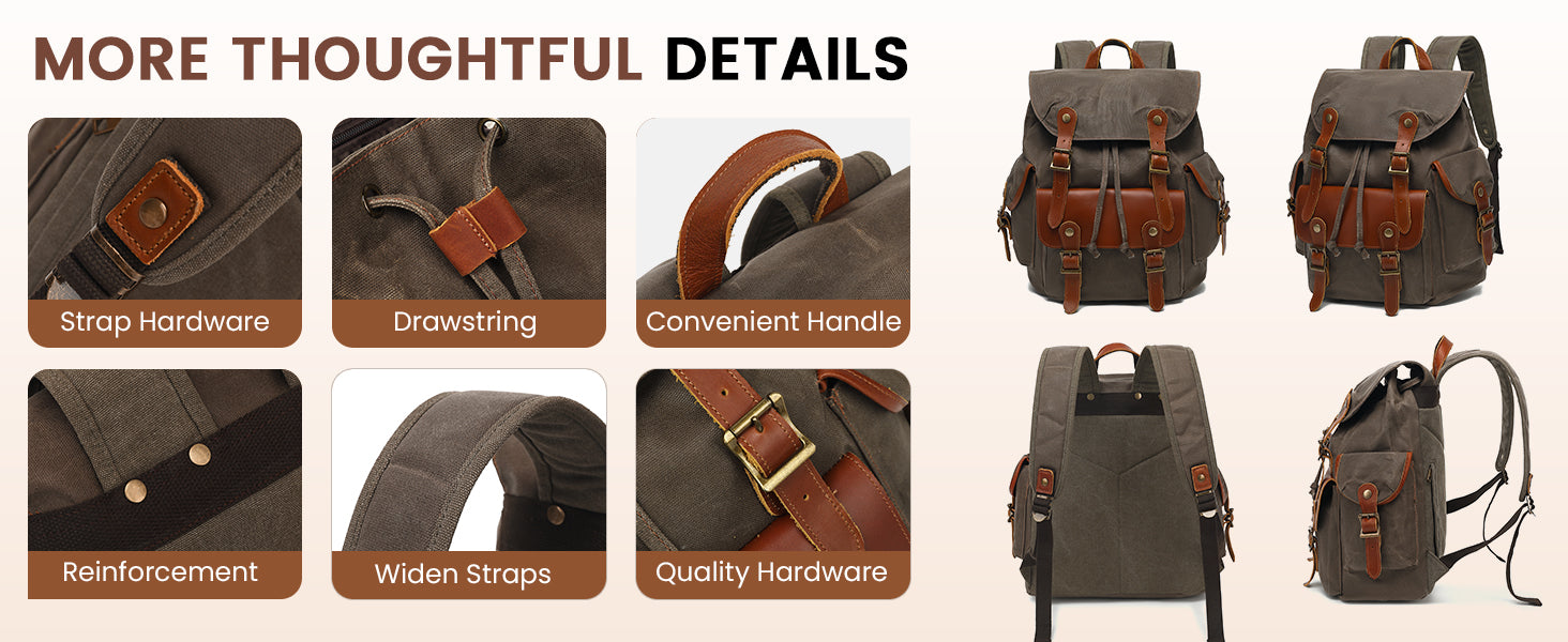 Our backpack isn't just a product,it's an experience. A rucksack that fits your lifestyle, a mens leather backpack that withstands the rigors of time, a leather backpack for women that complements their elegance, and a waxed canvas backpack that tells a story of enduring quality.